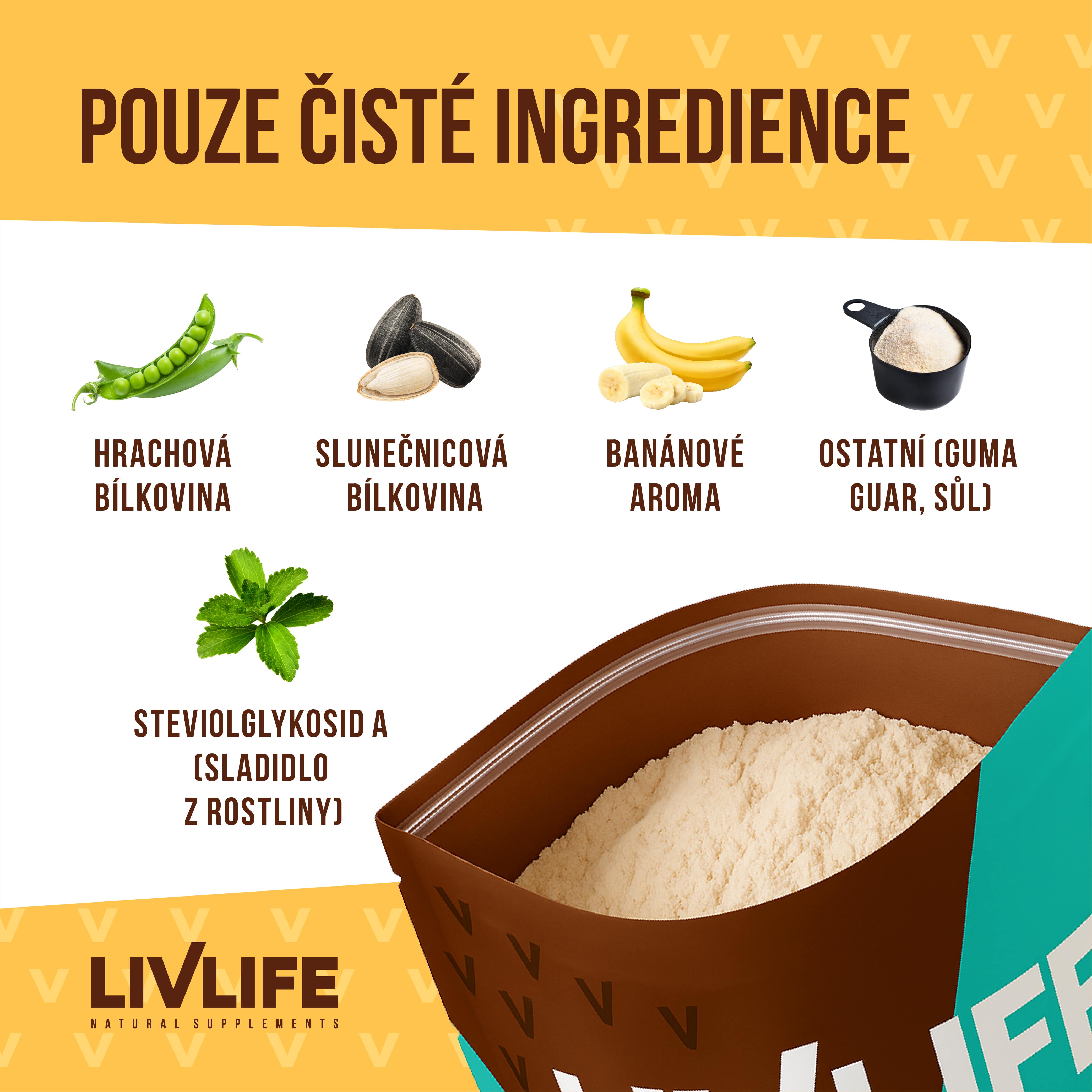 Dopřejte si lahodný rostlinný protein s autentickou banánovou chutí. LIVLIFE Vegan Protein – Banán kombinuje hrachovou a slunečnicovou bílkovinu pro kompletní spektrum aminokyselin, které podpoří regeneraci svalů i jejich růst. Lehce stravitelný, bez přidaného cukru, slazený přírodními steviol-glykosidy. Ideální volba po tréninku nebo kdykoli během dne.