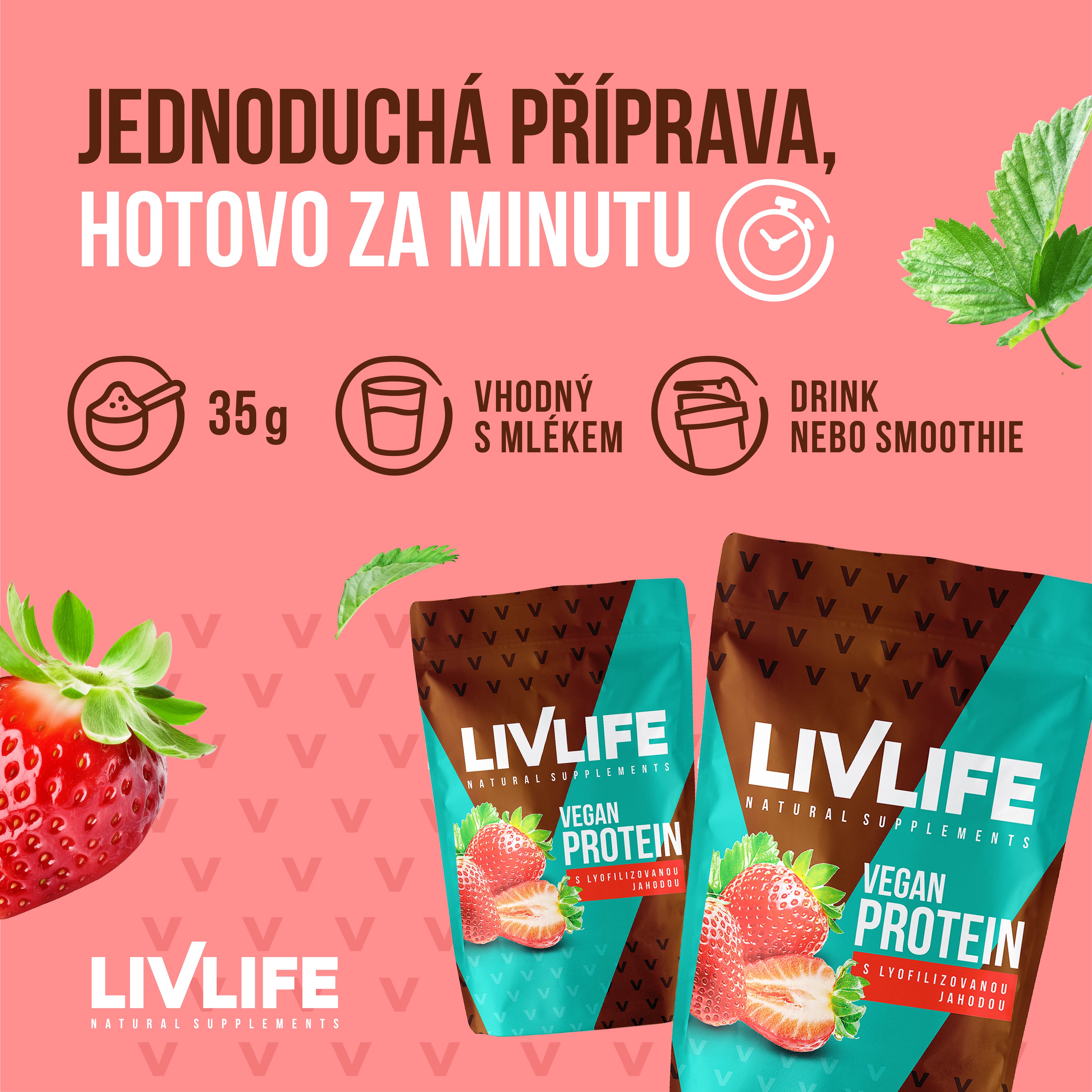 LIVLIFE Vegan Protein – Jahoda je čistý rostlinný nápoj na bázi hrachové a slunečnicové bílkoviny, obohacený o mrazem sušené jahody pro přirozenou a osvěžující chuť. Ideální volba pro každodenní doplnění bílkovin – bez cukru, bez kompromisů.