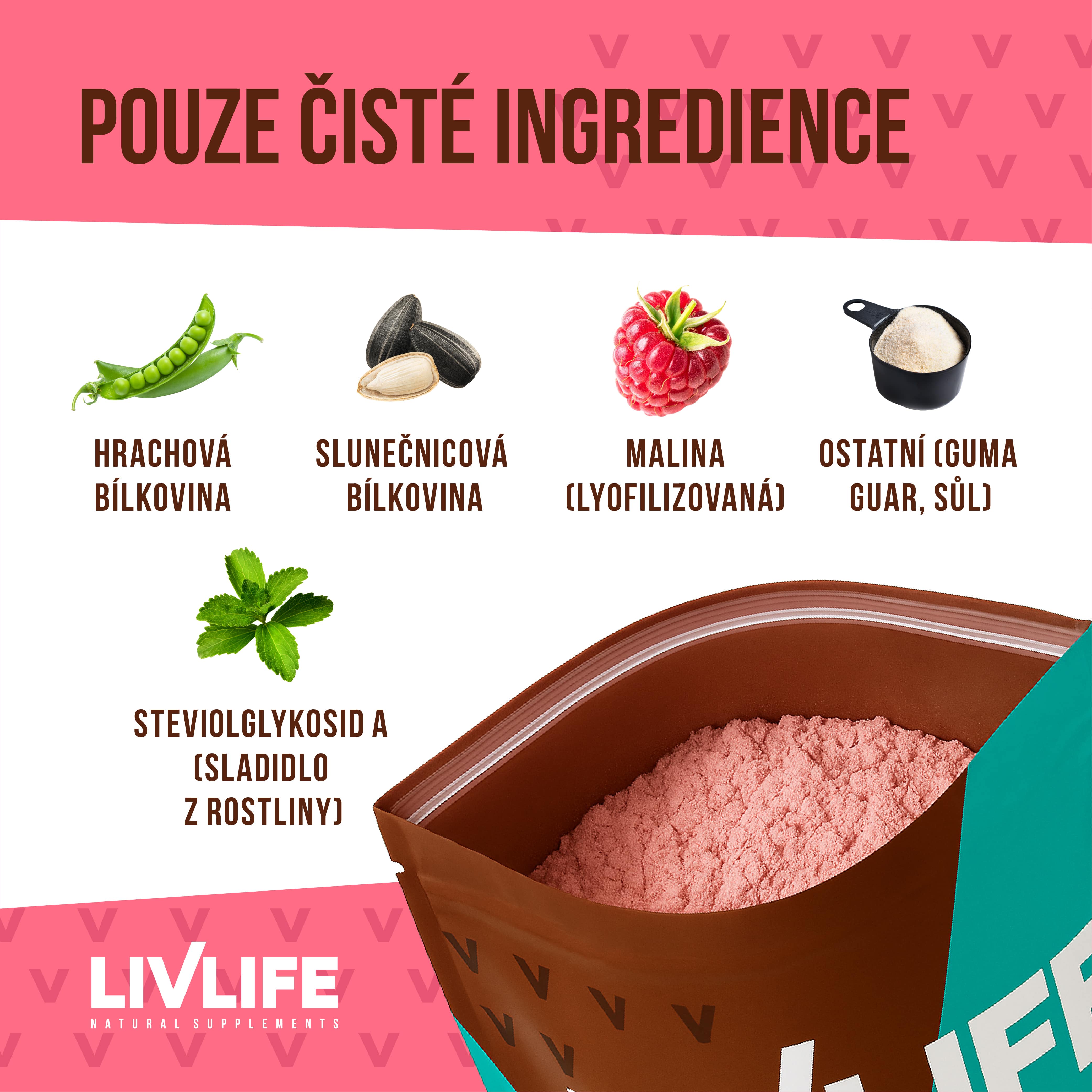 LIVLIFE Vegan Protein – Jahoda je čistý rostlinný nápoj na bázi hrachové a slunečnicové bílkoviny, obohacený o mrazem sušené maliny pro přirozenou a osvěžující chuť. Ideální volba pro každodenní doplnění bílkovin – bez cukru, bez kompromisů.
